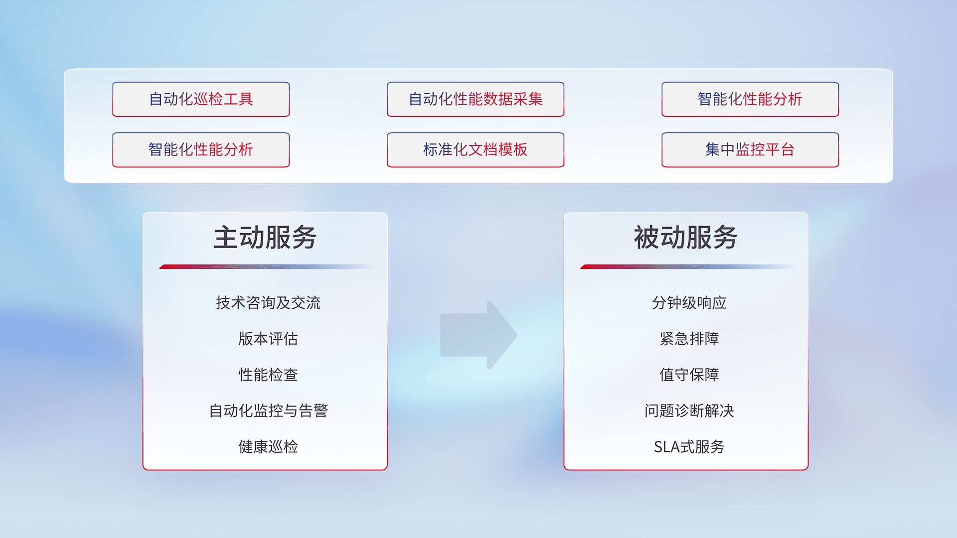 智能化工具和标准化文档,,保障服务质量,,,,提供主动服务(包含技术咨询、、、、版本评估、、、、性能检查、、、自动化监控与告警、、健康巡检)和被动服务包含(分钟级响应、、紧急排障、、、、值守保障、、问题诊断解决、、、SLA服务)。。。。